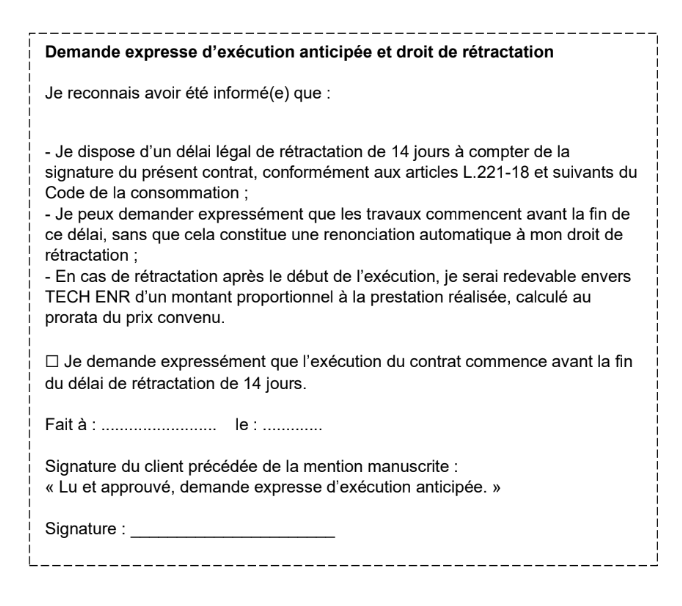 TECH ENR informera systématiquement le Client de ces modalités au moment de la signature de la commande.
